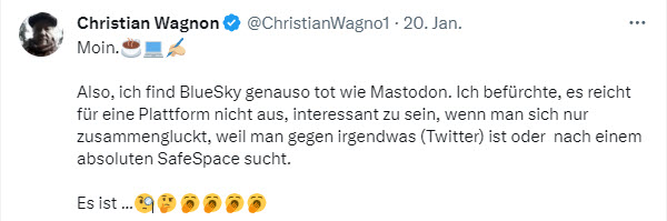 Mir geht es genauso. Ich habe mich in meiner Autorenbubble auf X lange sehr wohl gefühlt. Dann kam die große Abwanderungsbewegung, weil man ein Zeichen gegen Elon Musk setzen wollte. Geschätzte Kolleginnen und Kollegen waren plötzlich nur noch auf Mastodon zu finden. Ich habe mir diese Plattform kurz angesehen, kam mit ihr nicht zurecht und bin dort wieder weg. Dann ging es ab zu BlueSky. Für mich ein twitter-Klon, also dachte ich, da muss es ja besser laufen. Macht es aber nicht. Der Austausch ist weg, die Debatte. Man bleibt unter sich.